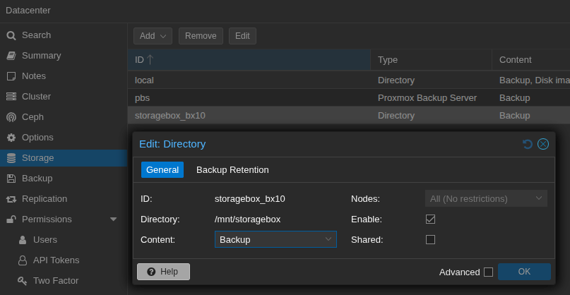 “FSTab” steht für “File System Table” und durch den Eintrag wird der Mount-Point fest in das ProxMox-Dateisystem hinterlegt, sodass dieser nach jedem Proxmox-Reboot automatisch wiederhergestellt wird